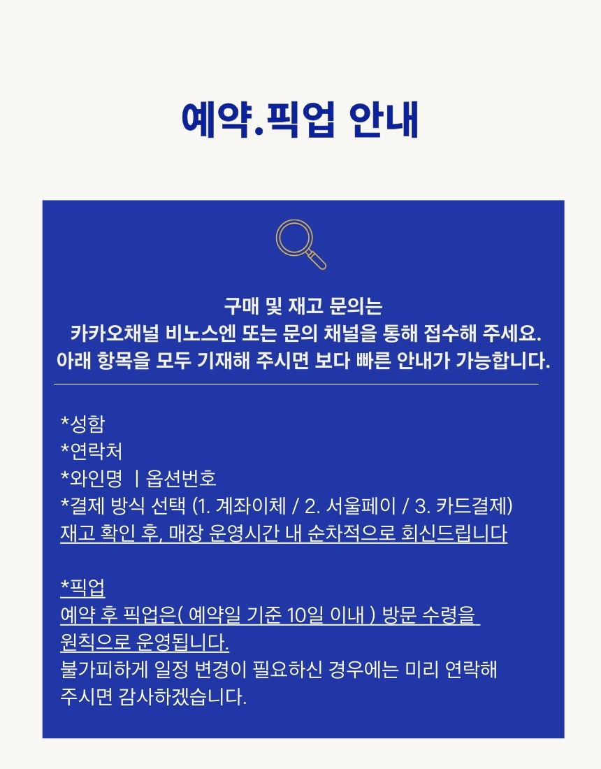 와인 선택하신 후 결제 ( 계좌이체 ) 로 선택 구매 후 메모에 (예) 서울페이결제 "기재하시면 되십니다 !